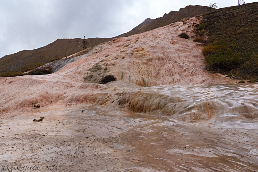 Чуть за Крестовым перевалом сложно пропустить "нарзанный источник" или "травертиновые террассы" - странные образования, созданые текущей минеральной водой, столь насыщенной, что часть минералов остаётся и создаёт такую вот горку, единственная ассоциация, которая родилась тут у меня - соляные горы у Мёртвого моря. Цвет не тот, конечно, (соль Мёртвого моря белая, на крайняк сероватая, а тут переливы от рыжего до коричневого) но структура похожа